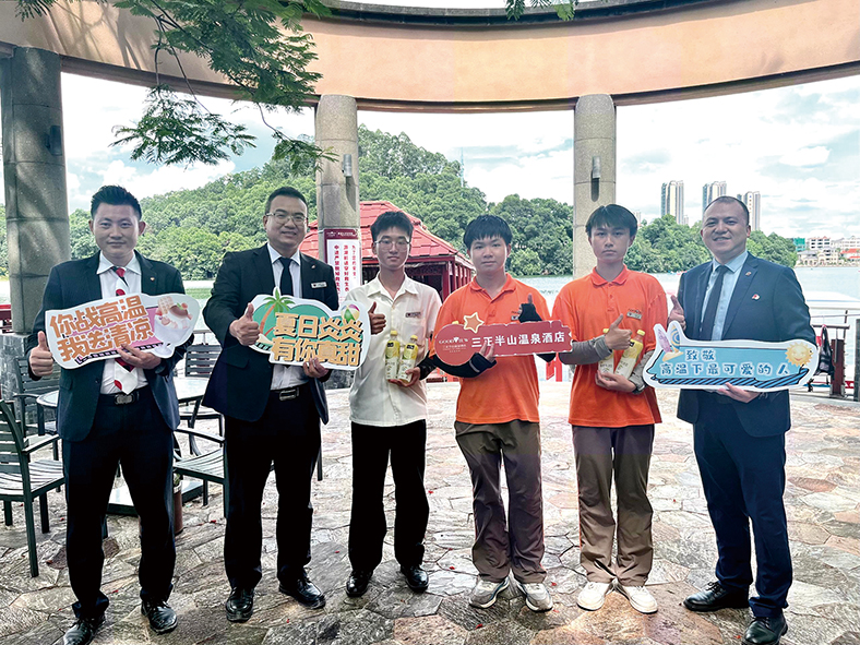 “你战高温,我送清凉!”为向在高温下辛勤工作的同事们表示致敬,营造健康、快乐、温暖的工作氛围, 8月5日和12日,塘厦三正半山温泉酒店分别开展了“夏日送清凉”活动,副总经理潘林带领各部门管理团队,共同为在酒店户外坚守岗位的保安部、温泉康体部、房务部、工程部、礼宾部等部门同事送上“冰冰凉”的解暑饮品,让同事们倍感惊喜。