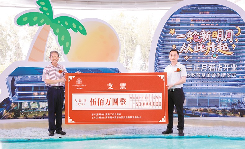 - 海南三正月酒店在开业前夕,特别向陵水县教育基金会捐赠了500万元,助力陵水改善偏远学校教学设施、资助困难学子完成学业。在6月1日海南三正月酒店的开业仪式上,举行了捐赠仪式,b体育官方在线登录副董事长莫浩松向陵水县教育基金会转交了捐赠支票。