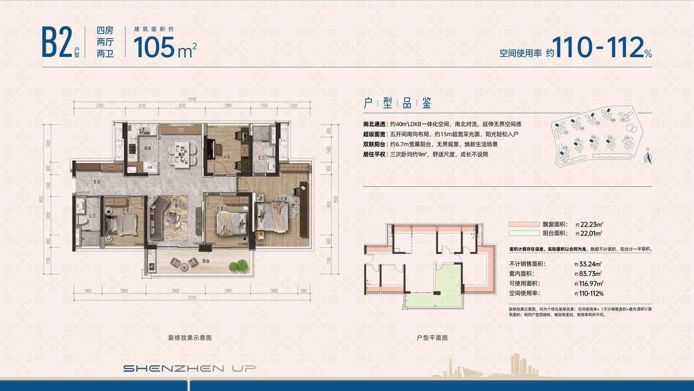 B2户型,105平方米四房两厅两卫