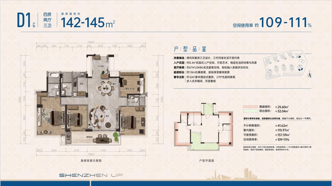 D1户型,142-145平方米四房两厅三卫