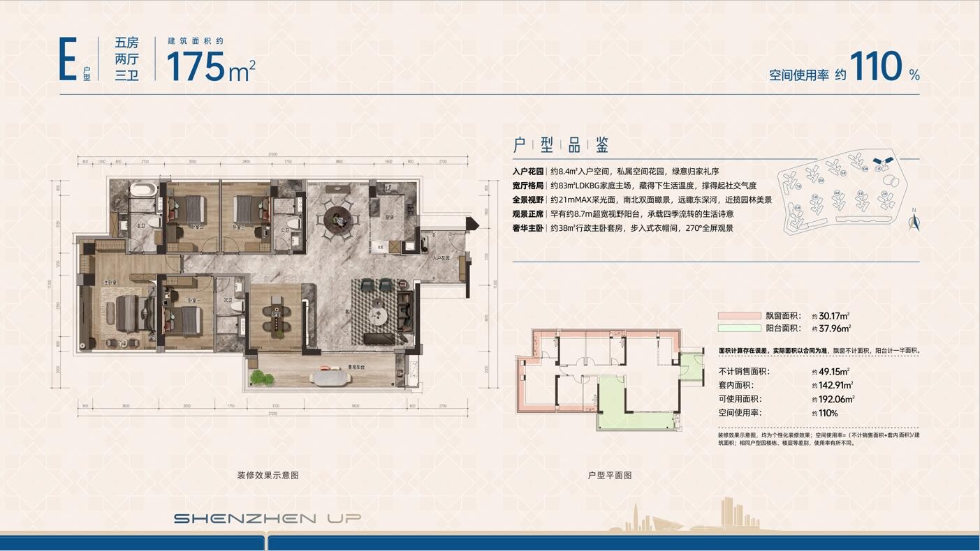 E户型,175平方米五房两厅三卫